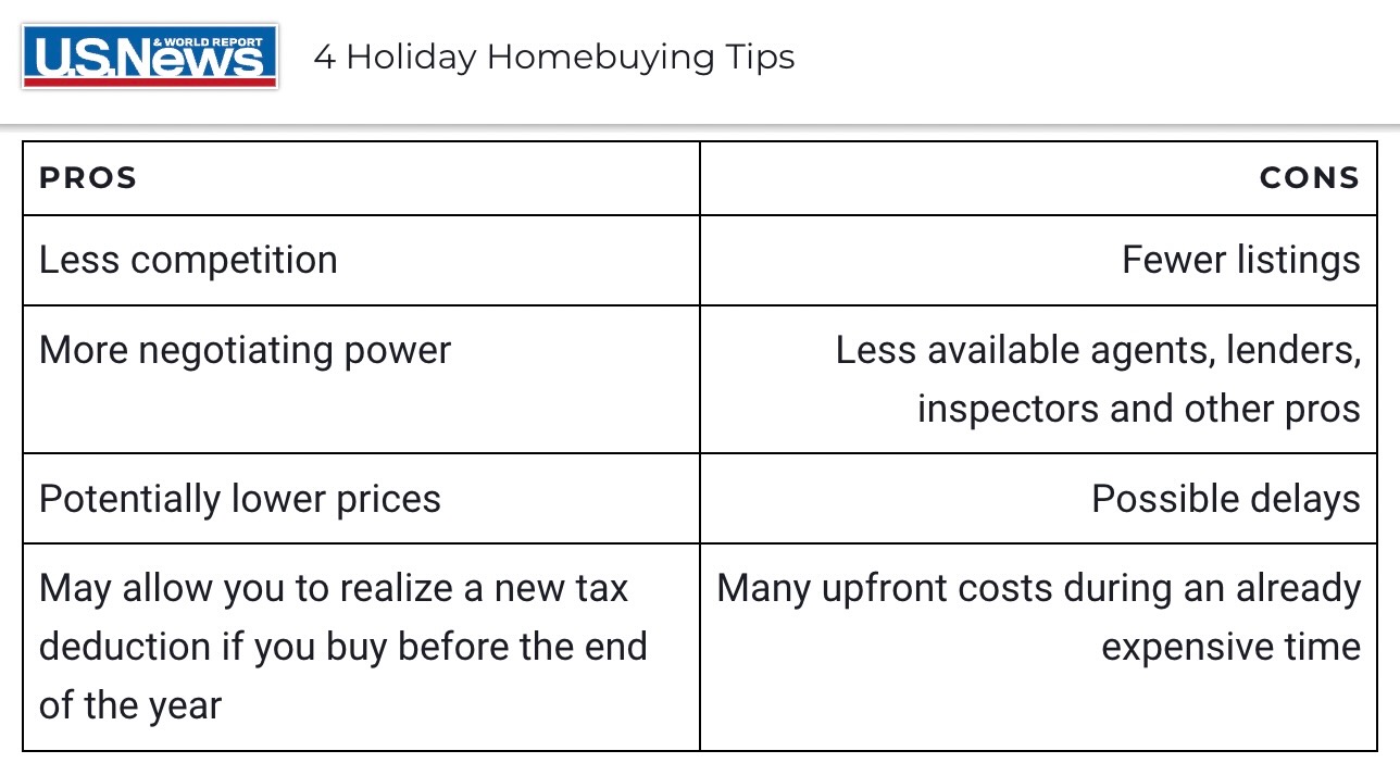When evaluating buying or selling in Q4, U.S. News and World Report says, “There are typically fewer buyers in the market, which gives you more negotiating power.” For sellers, the people who are looking at their home are serious. Check out the Pros and Cons courtesy of U.S. News & World Report: